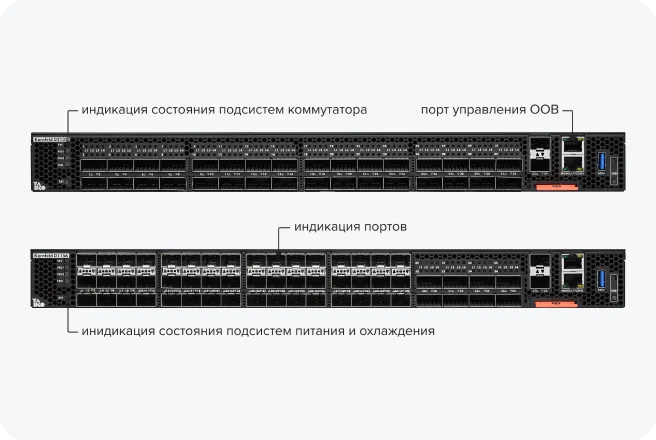 и QSFP28, выделенная индикация и нумерация breakout-интерфейсов, работа управляющего порта, питание и состояние вентиляторов через системный индикатор. Вся необходимая информация —