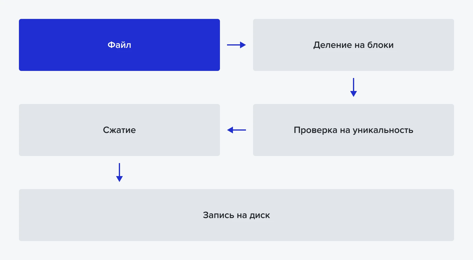 После разбиения файла на блоки для каждого из них рассчитывается криптографический хэш, который гарантирует уникальность блока. Сам файл описывается массивами ссылок на блоки. Ссылкой (ключом) и является уникальный хэш. По нему система ищет, какие из новых блоков являются дубликатами ранее уже записанных.
