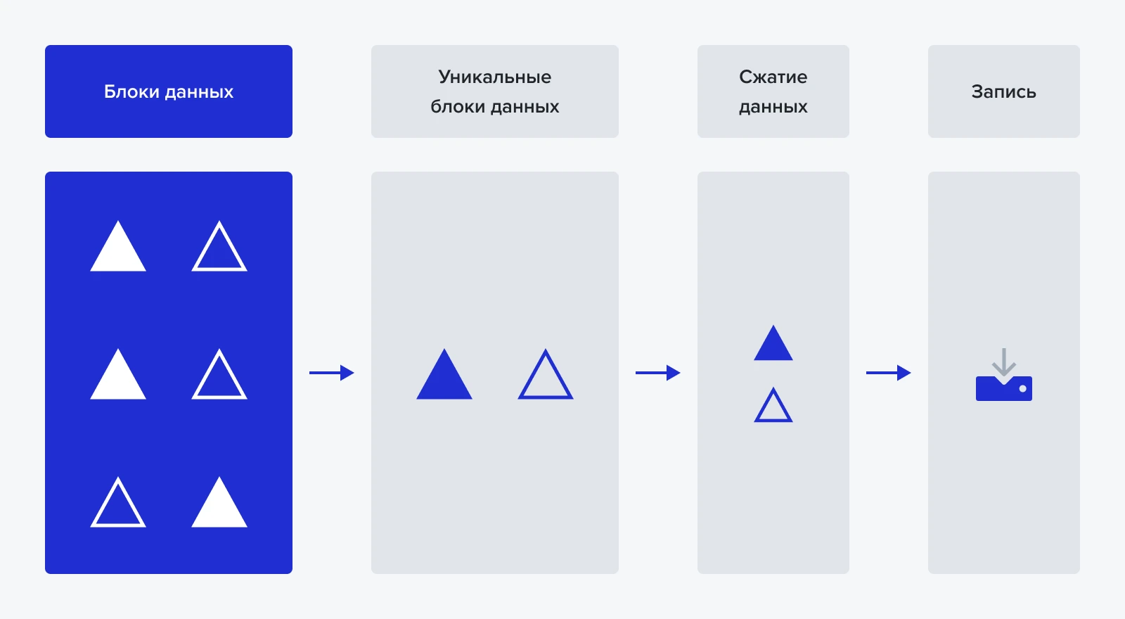 Запись только уникальных блоков данных ускоряет процесс резервного копирования, а также передача меньшего объёма данных снижает нагрузку на сеть.